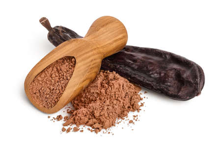 Carob pod and powder in wooden scoop isolated on white background with and full depth of field.