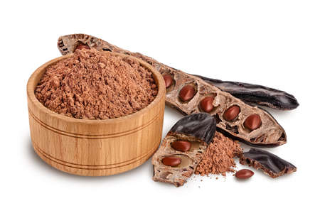 Carob pod and powder in wooden bowl isolated on white background with clipping path and full depth of field.