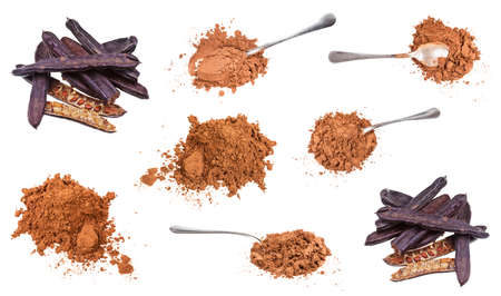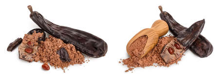 Organic carob bean, pod and carob powder isolated on white background. Healthy cocoa alternative.