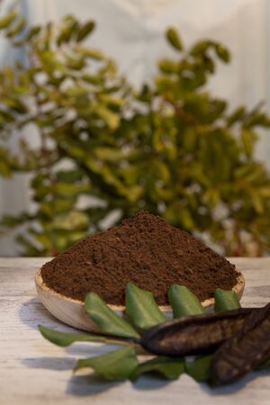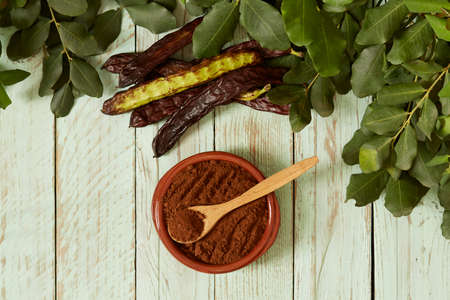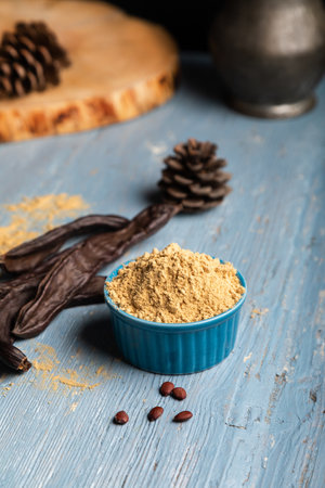 Carob flour in a ceramic plate on wooden boards. In the background carob branches. Montuiri, Mallorca, Spain
