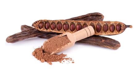 Carob pod and powder in wooden scoop isolated on white background with clipping path and full depth of field. Set or collection
