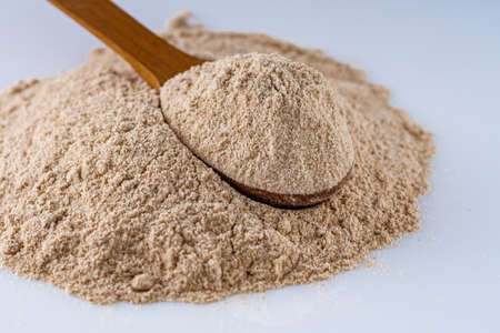 Bird cherry flour in brown wooden spoon on white background, close-up. design element. Shredded berry Bird cherry use in baking and healthy smoothie.