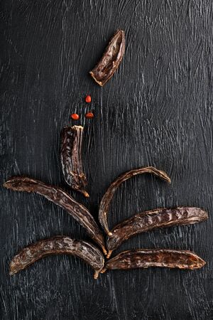 closeup of some ripe carob beans on a rustic dark green surface
