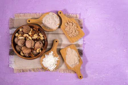 Various gluten free flour on table with nuts. Almonds, cashews, walnuts. flat lay.