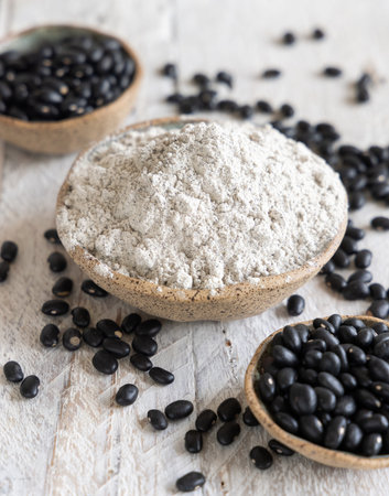 Ceramic bowls with black beans flour and dried beans closeup. Healthy eating and vegetarian concept. Traditional Latin American cousin ingredient