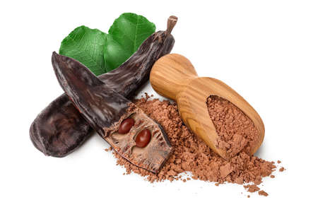 Carob pod and powder in wooden scoop isolated on white background with clipping path and full depth of field.