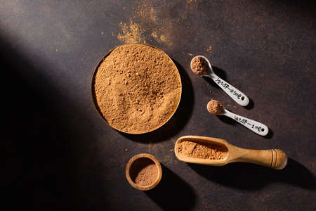 cocoa powder in wooden scoop closeup background