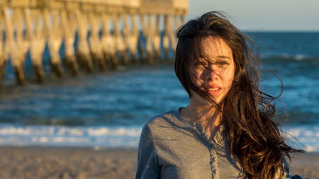 Young Asian-American at North Carolina Beach in winter with face covered by hair