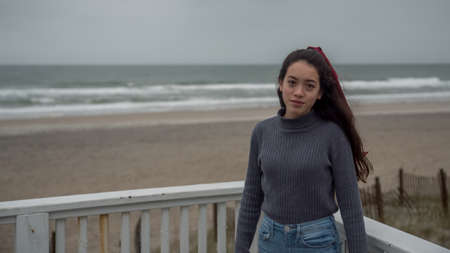 Young Asian-American at North Carolina Beach in winter with red hair ribbon and blue jeans
