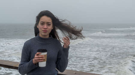Young Asian-American at North Carolina Beach in winter on windy foggy day holding cup of coffee