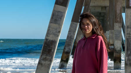 Young Asian-American at North Carolina Beach in winter in maroon jacket