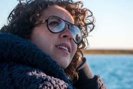 Closeup on beautiful happy female face over ocean background. Vacation travel adventure
