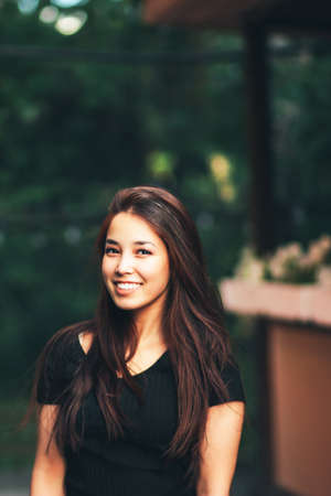 Portrait of beautiful happy long hair asian girl in black t-shirt on the street
