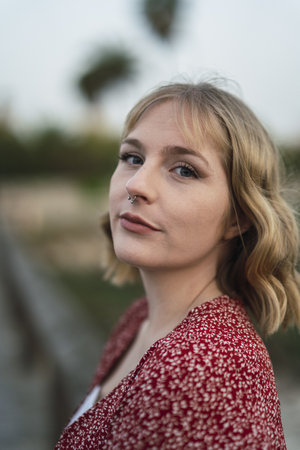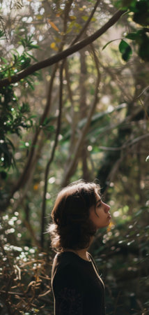 Young woman thoughtfully gazing into the distance in a park during golden hour surrounded by nature