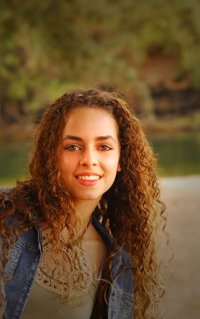 Outdoor portrait of beautiful happy mixed race African American girl teenager female young woman on a beach smiling laughing with perfect teeth in golden sunset evening sunshine