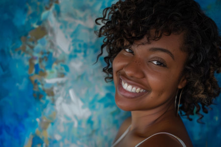 A young woman with curly brown hair stands in front of a brightly painted wall, smiling brightly.