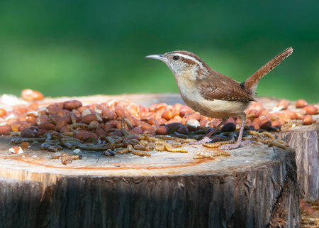 Carolina Wren Thryothorus ludovicianus perching on a log and eating worms in Maryland during the Spring