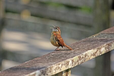 A single cute Carolina wren ( Thryothorus ludovicianus ) perching on the wooden fence on the blurry garden background, Autumn in Ga USA.