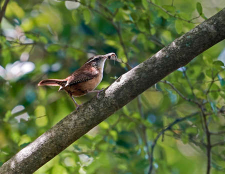 Mother Carolina Wren with insect in her beak rests on branch in spring woodland setting, closeup. State bird of South Carolina, they mate for life.