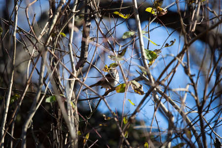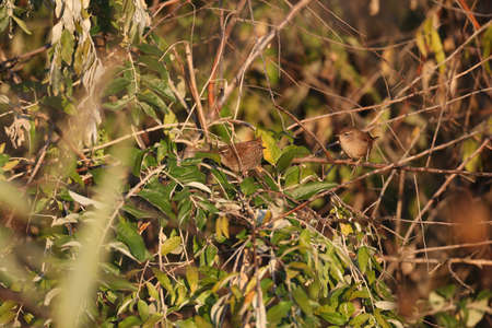 Wrens are photographed in their natural habitat in dense bushes with the rays of the rising sun. Unusual colors picture