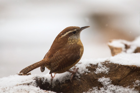 Carolina Wren Thryothorus ludovicianus perching on a log in Maryland during a blizzard