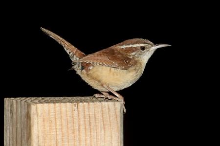 Carolina Wren (Thryothorus ludovicianus) on a post with a black background