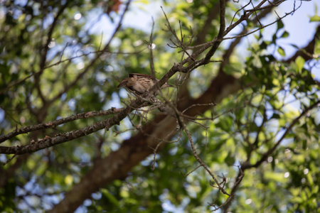Male house sparrow looking down from a bare tree branch isolated on a green bokeh background. This photo was taken in an Iowa yard on a late summer morning.