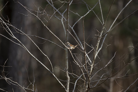 Swamp sparrow (Melospiza georgiana) looking out from its perch on a bare tree