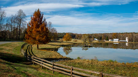 Farm buildings and their reflection on a lake in North Carolina
