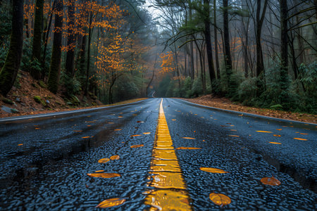 Wet asphalt road winds through a colorful autumn forest on a rainy day.