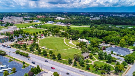 Drone Aerial of Barnet Park and Amphitheater in Downtown Spartanburg South Carolina SC.