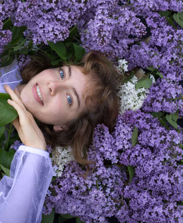 Portrait of an attractive woman surrounded by lilac bushes. Spring and summer, seasonal photos. Front view.