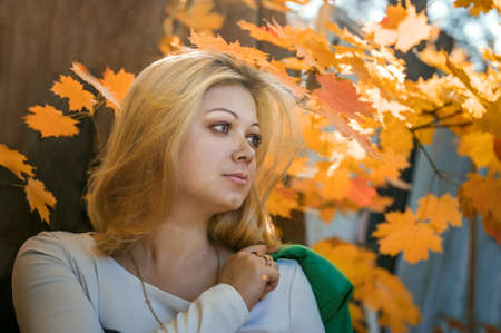 Portrait of a young beautiful blonde on the background of autumn leaves. thoughtful young woman looks in front of her