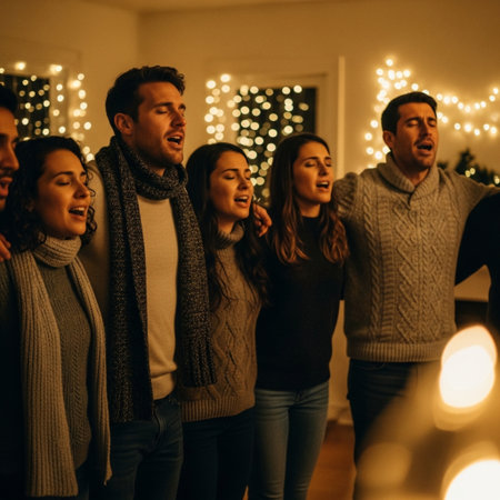 Choir members joyfully singing carols by candlelight, creating a warm atmosphere during festive Christmas celebrations filled with harmony