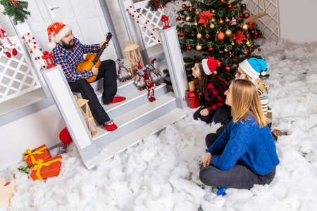 Christmas cozy company of people winter holidays concept photography with bearded man play guitar for three girls in festive decorated room