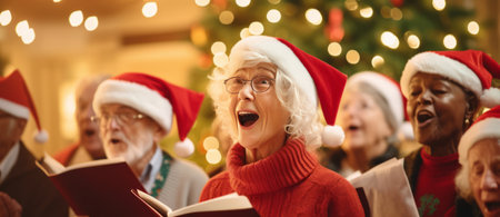 A heartwarming scene of Eldery group singing Christmas carols, creating a symphony of joy in a festively decorated living room.High resolution AI generated