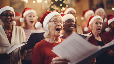 A spirited group of grandma eldery in Santa hats, immersed in the joy of singing Christmas carols in a festive setting.High resolution AI generated