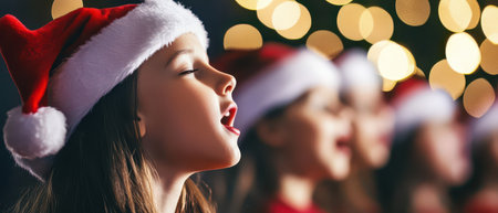 A group of children wearing santa hats sing carols joyfully surrounded by warm lights celebrating the spirit of christmas together in harmony.