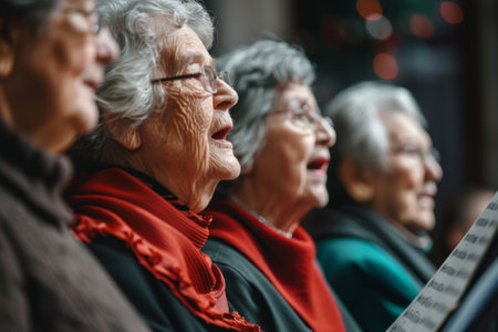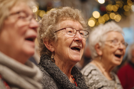 A group of elderly women sings happily, sharing smiles and laughter. The setting is warm and inviting with holiday decorations adding a cheerful atmosphere.