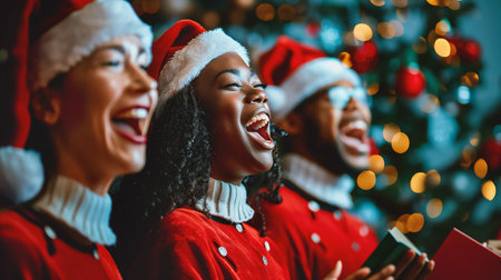 A jovial group of carolers, donned in Santa hats, spreading the spirit of Christmas with song, gathered around a beautifully lit tree.High resolution AI generated
