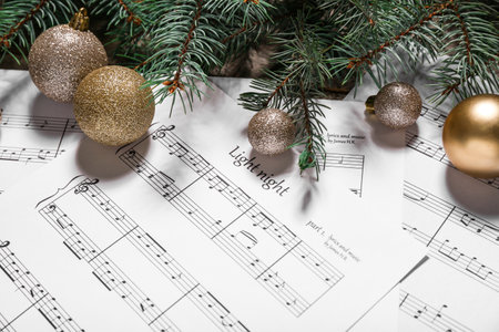 Music sheets, beautiful Christmas balls and fir branches, closeup