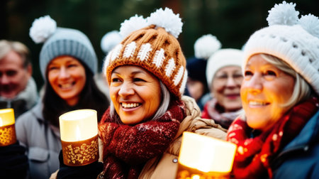 A beautiful scene capturing elderly women adorned in colorful traditional costumes, holding candles with warm smiles during a winter celebration, highlighting cultural heritage.