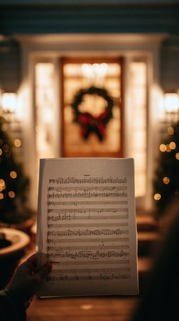 A hand displays a simple song sheet at chest level, with a festive entrance adorned with a wreath and soft lighting, evoking a warm holiday spirit