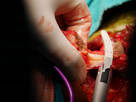 Process of trauma surgery operation. Group of surgeons in operating room with surgery equipment. Medical background