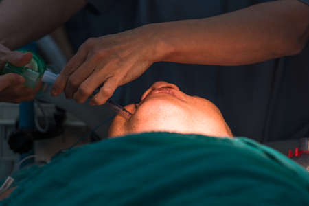 Surgeon and his assistant performing cosmetic surgery on nose in hospital operating room. Nose reshaping, augmentation. Rhinoplasty
