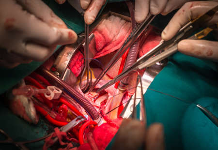 Close up of Open Heart Surgery with Cardiopulmonary Bypass. Heart Valve Operation