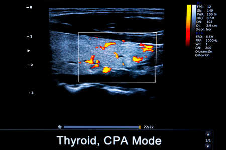 Colourful image of modern ultrasound monitor. Ultrasonography machine. High technology medical and healthcare equipment. Ultrasound imaging or sonography used in medicine. Thyroid.
