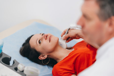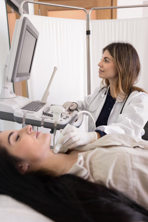 Adult woman having thyroid exam with ultrasound at doctors office. Healthcare concept