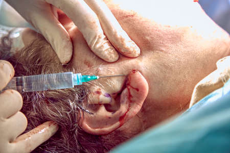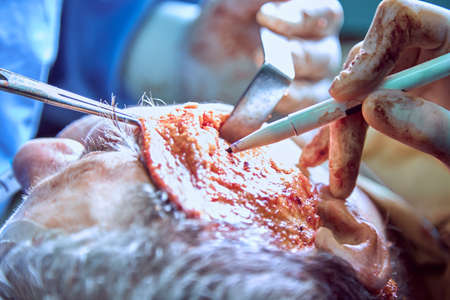 Facial plastic surgery operation. Face lift surgery. Surgeon separated the skin from the patients face