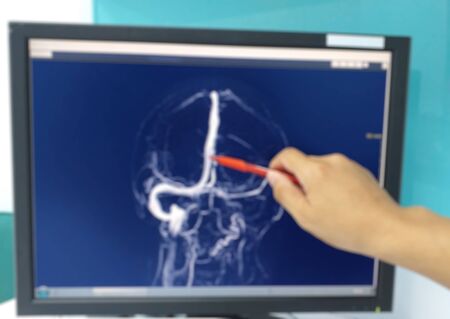 Blurred image close up hand doctor point LCD moniter told the MRA and MRV brain examination results to the patients in the room.Medical healthcare and technology concept.